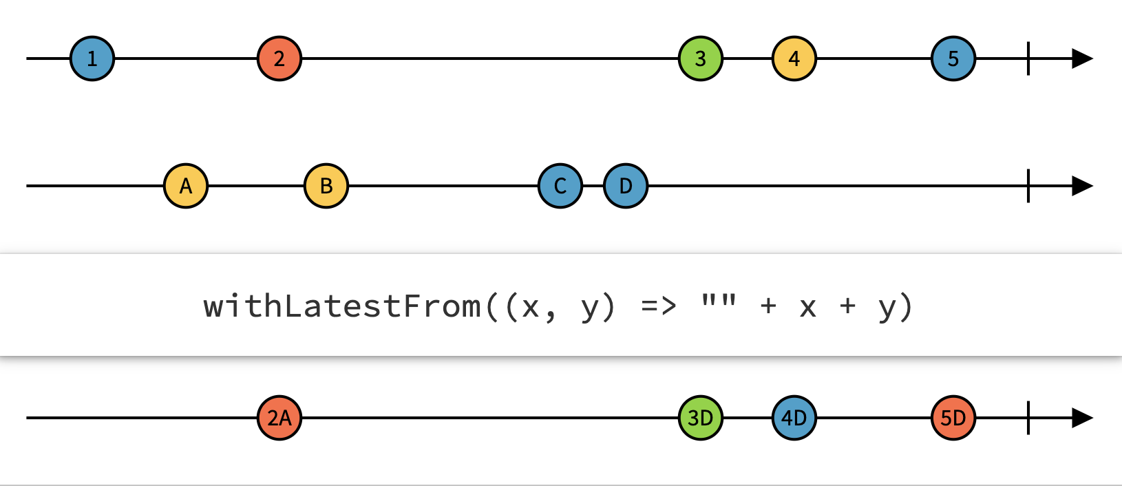 - withLatestFrom: 2개의 Observable을 뒀을 때, 1번에서 방출이 되는 첫번 째 값은 두고 2번에서 방출되는 값을 1번에서 방출되는 두번 째 값과 결합하여 방출