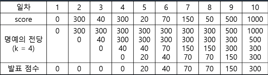 "명예의 전당"이라는 TV 프로그램에서는 매일 1명의 가수가 노래를 부르고, 시청자들의 문자 투표수로 가수에게 점수를 부여합니다. 매일 출연한 가수의 점수가 지금까지 출연 가수들의 점수 중 상위 k번째 이내이면 해당 가수의 점수를 명예의 전당이라는 목록에 올려 기념합니다. 즉 프로그램 시작 이후 초기에 k일까지는 모든 출연 가수의 점수가 명예의 전당에 오르게 됩니다. k일 다음부터는 출연 가수의 점수가 기존의 명예의 전당 목록의 k번째 순위의 가수 점수보다 더 높으면, 출연 가수의 점수가 명예의 전당에 오르게 되고 기존의 k번째 순위의 점수는 명예의 전당에서 내려오게 됩니다.