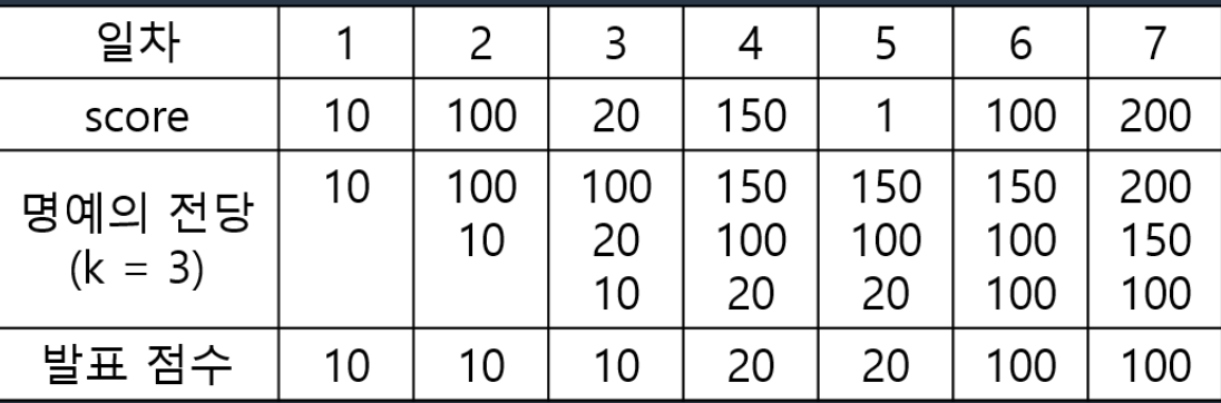 이 프로그램에서는 매일 "명예의 전당"의 최하위 점수를 발표합니다. 예를 들어, k = 3이고, 7일 동안 진행된 가수의 점수가 [10, 100, 20, 150, 1, 100, 200]이라면, 명예의 전당에서 발표된 점수는 아래의 그림과 같이 [10, 10, 10, 20, 20, 100, 100]입니다.