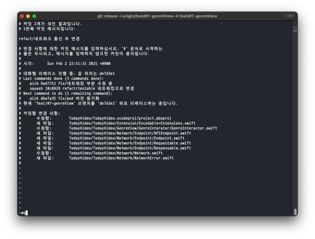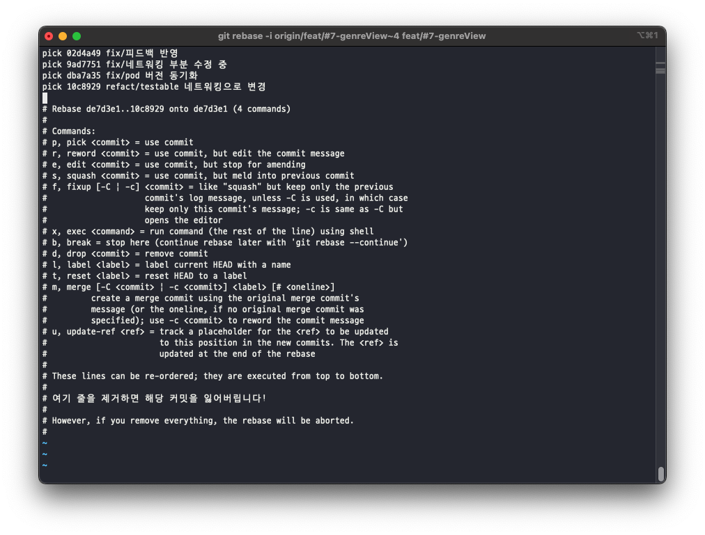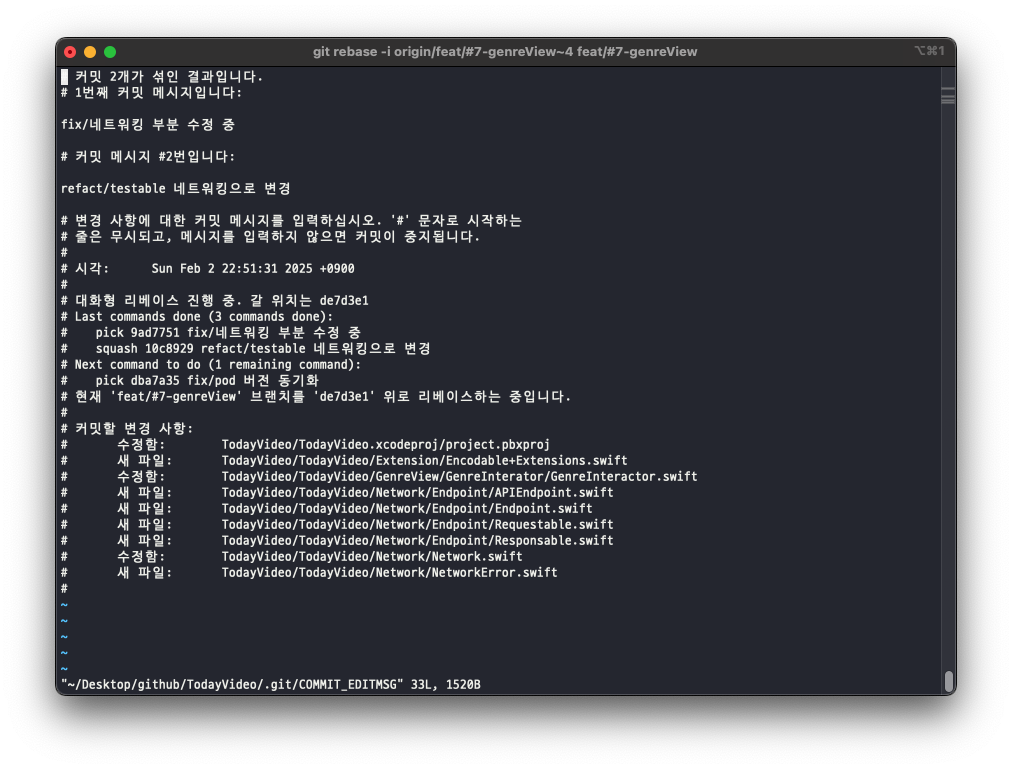 5. 새로이 합쳐진 커밋들의 메세지를 작성할 vi 편집창이 뜹니다.